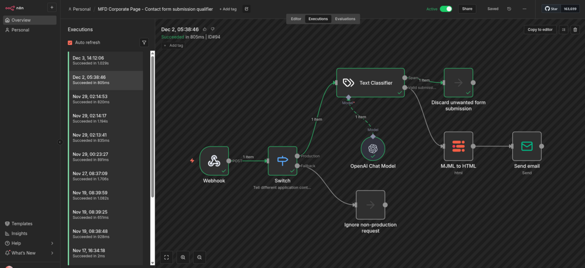 Der Einsatz von n8n bietet uns nicht zuletzt die Möglichkeit, ohne Änderungen an TYPO3 die Daten anstelle des E-Mailversands in ein CRM laufen zu lassen. Außerdem lassen sich die durchgeführten Workflows samt ihrer Daten und Entscheidungswege nachträglich sehr gut visualisieren und damit auf korrekte Funktion hin überprüfen. Das schafft auch in Kundenprojekten, in denen Daten an Drittsysteme übermittelt werden, sehr gute Einblicke und ermöglicht eine gezielte Fehleranalyse.