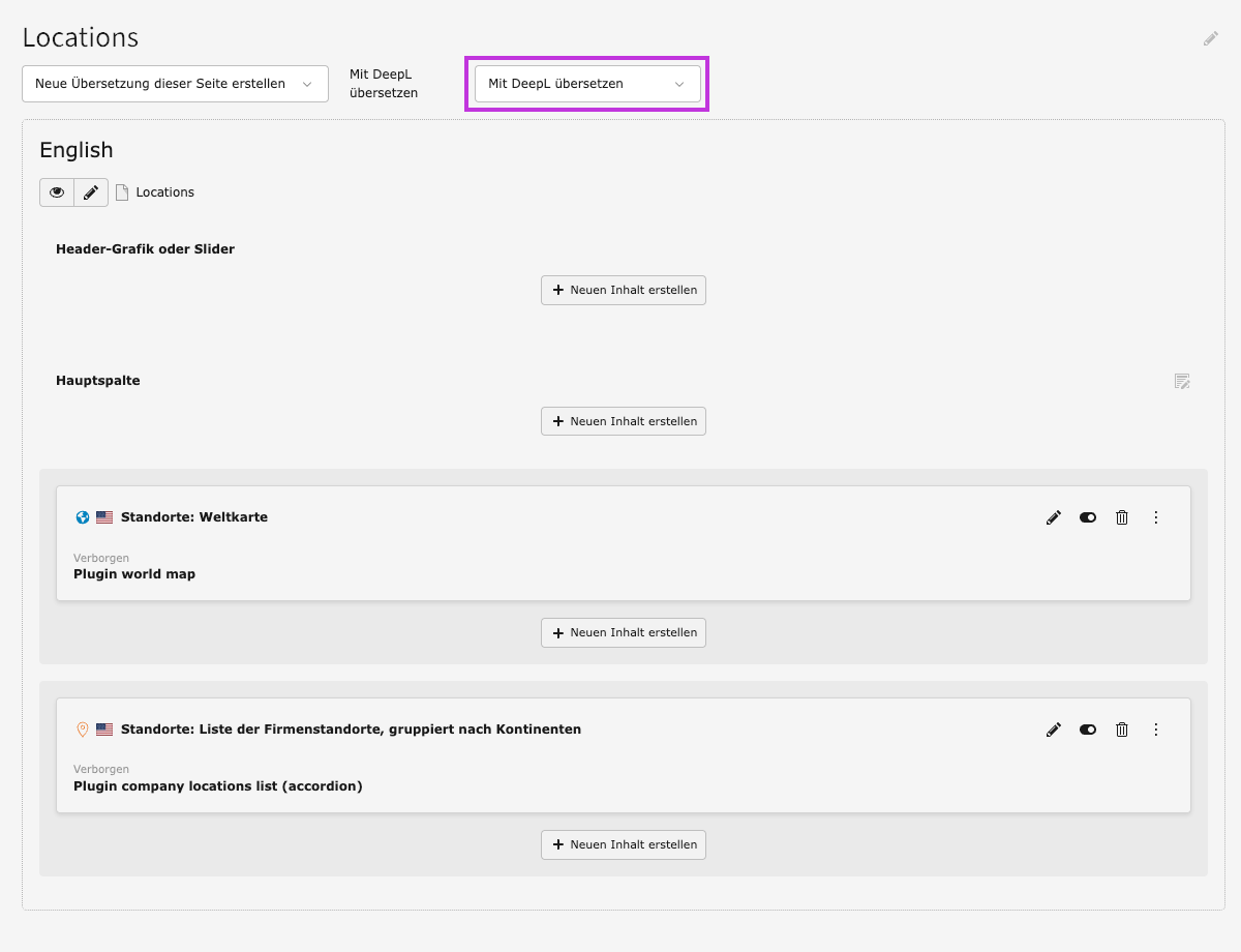 Hin und wieder kommt es vor, dass die Verwendung des DeepL-Buttons keine Übersetzungen zurückliefert. Die Datensätze der Zielsprache enthalten dann den unveränderten Originaltext.